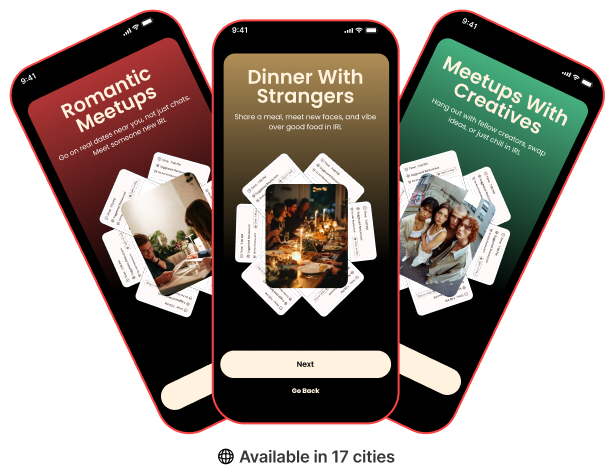 Pick between Romantic Dates, Dinner with Strangers, or Meetups with Creatives each with its own energy, so you can join what feels right.